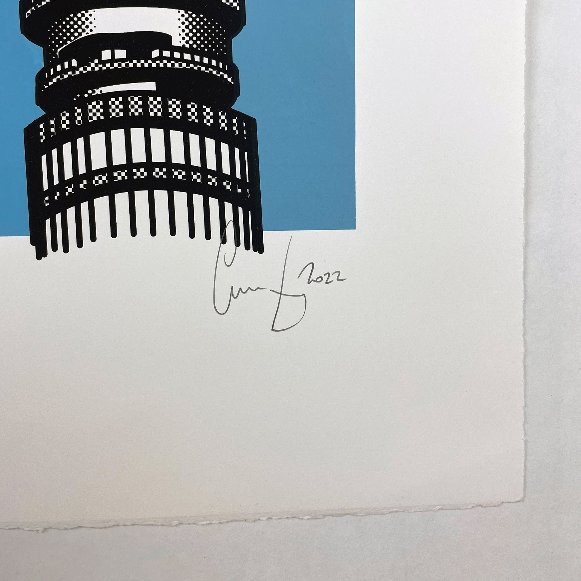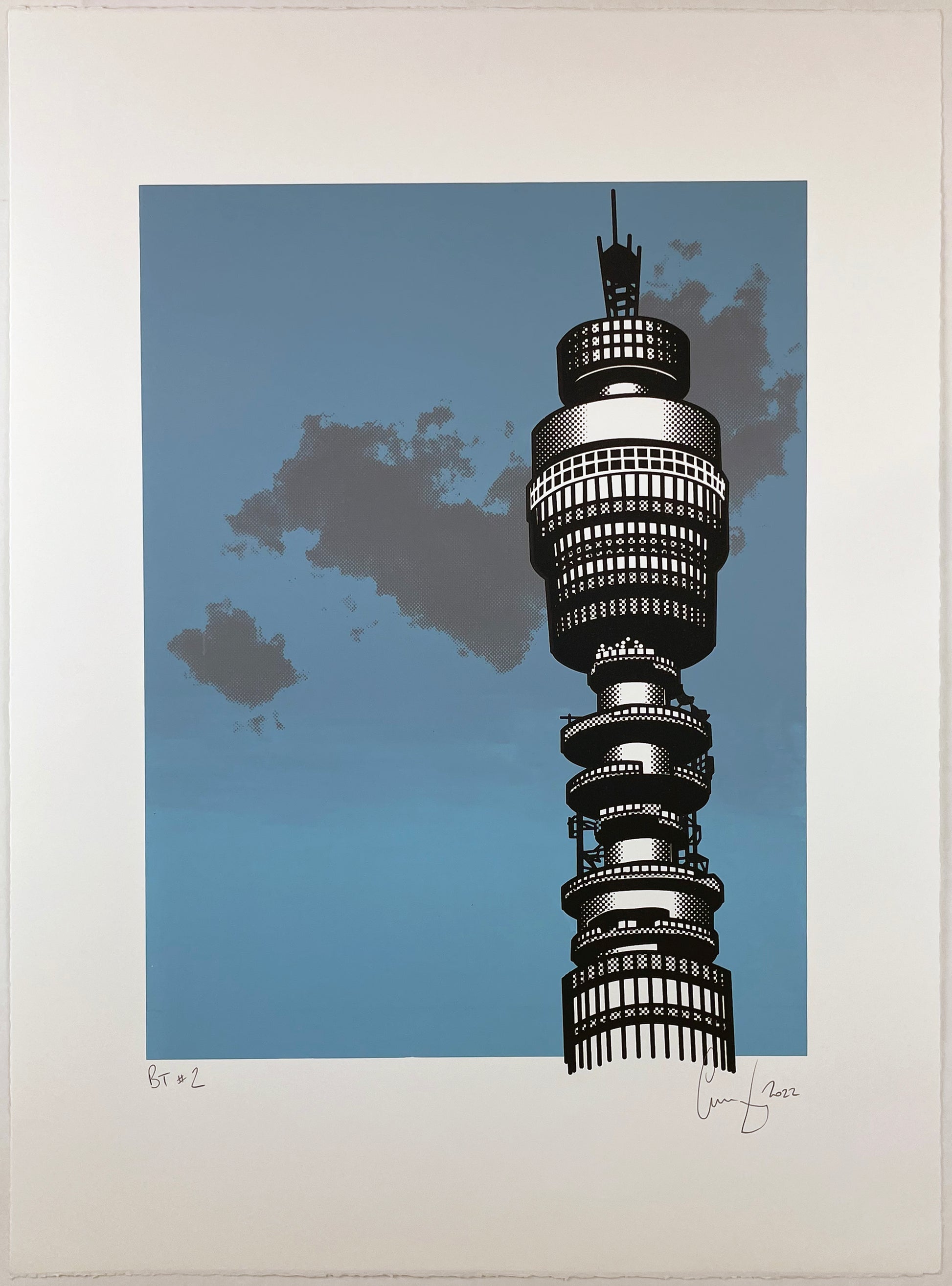 Hand-printed in three colours on 300gsm Somerset Satin, this work was produced as a varied edition in 2022. A total of 30 prints were produced. Each print is unique — the background, tower, and clouds shift in colour from piece to piece, making no two alike.