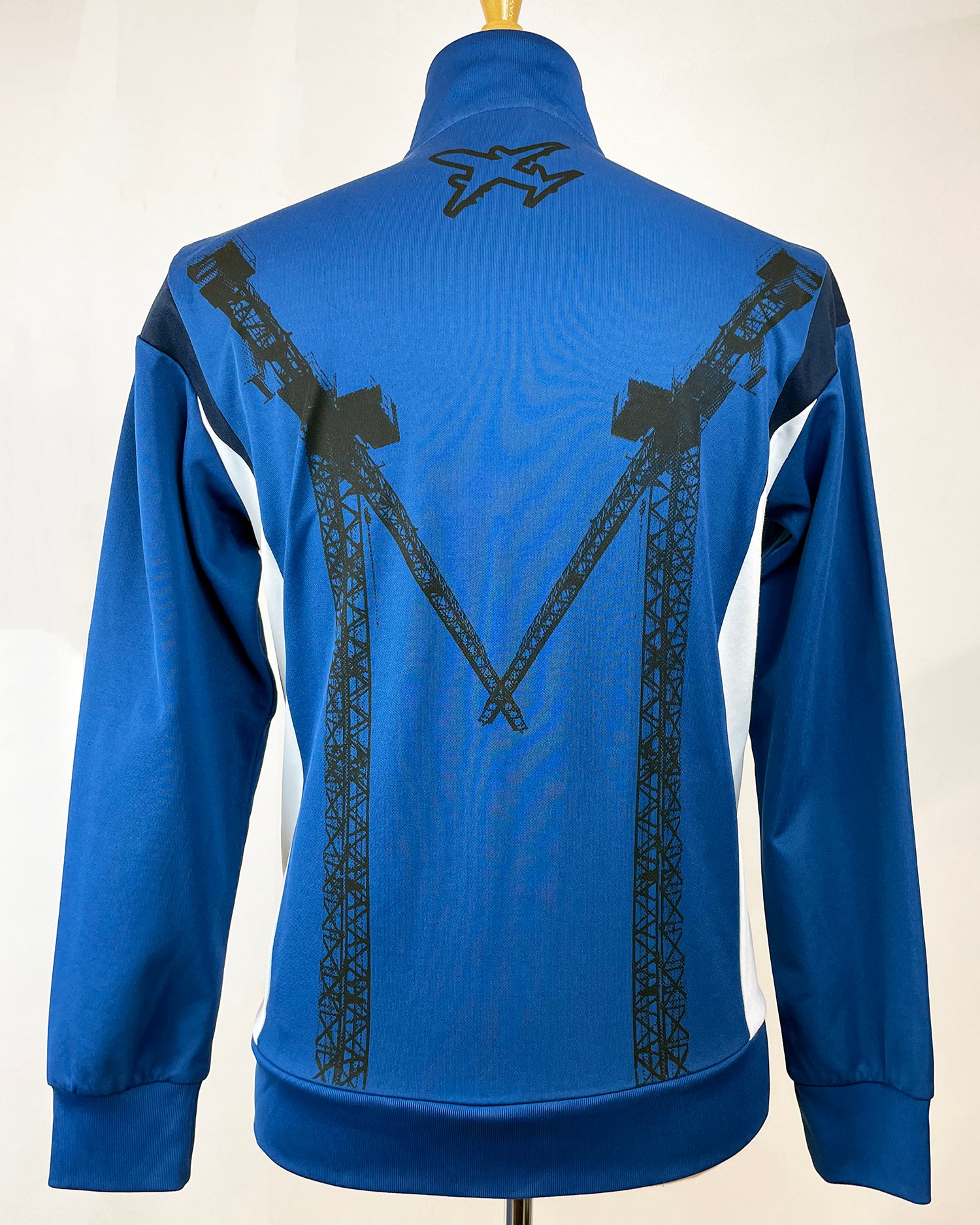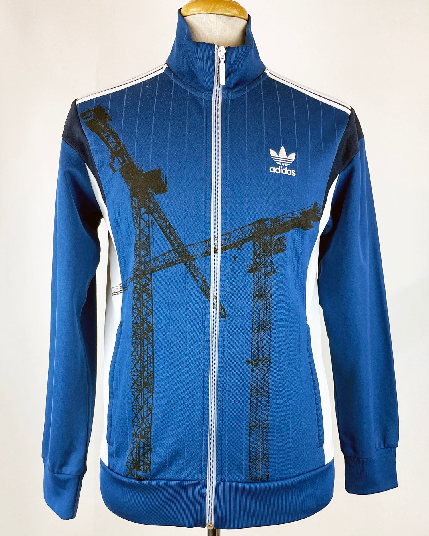 Hand printed with eco friendly water based inks, I take each finished track top home to machine wash it to test the washability of the print. These should be washed cool and hung to dry.