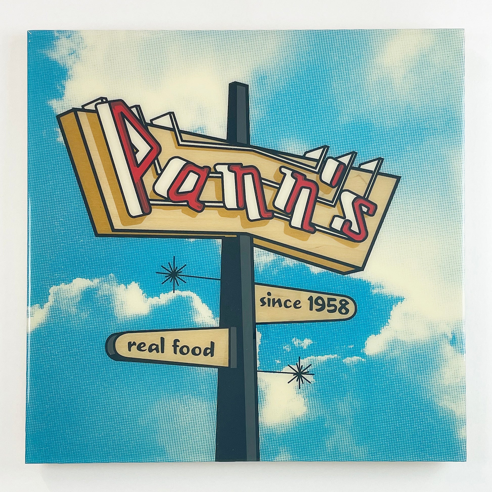 A close up of the sign from Pann's diner, Los Angeles, one of the original 'googie' style diners and its iconic neon sign.