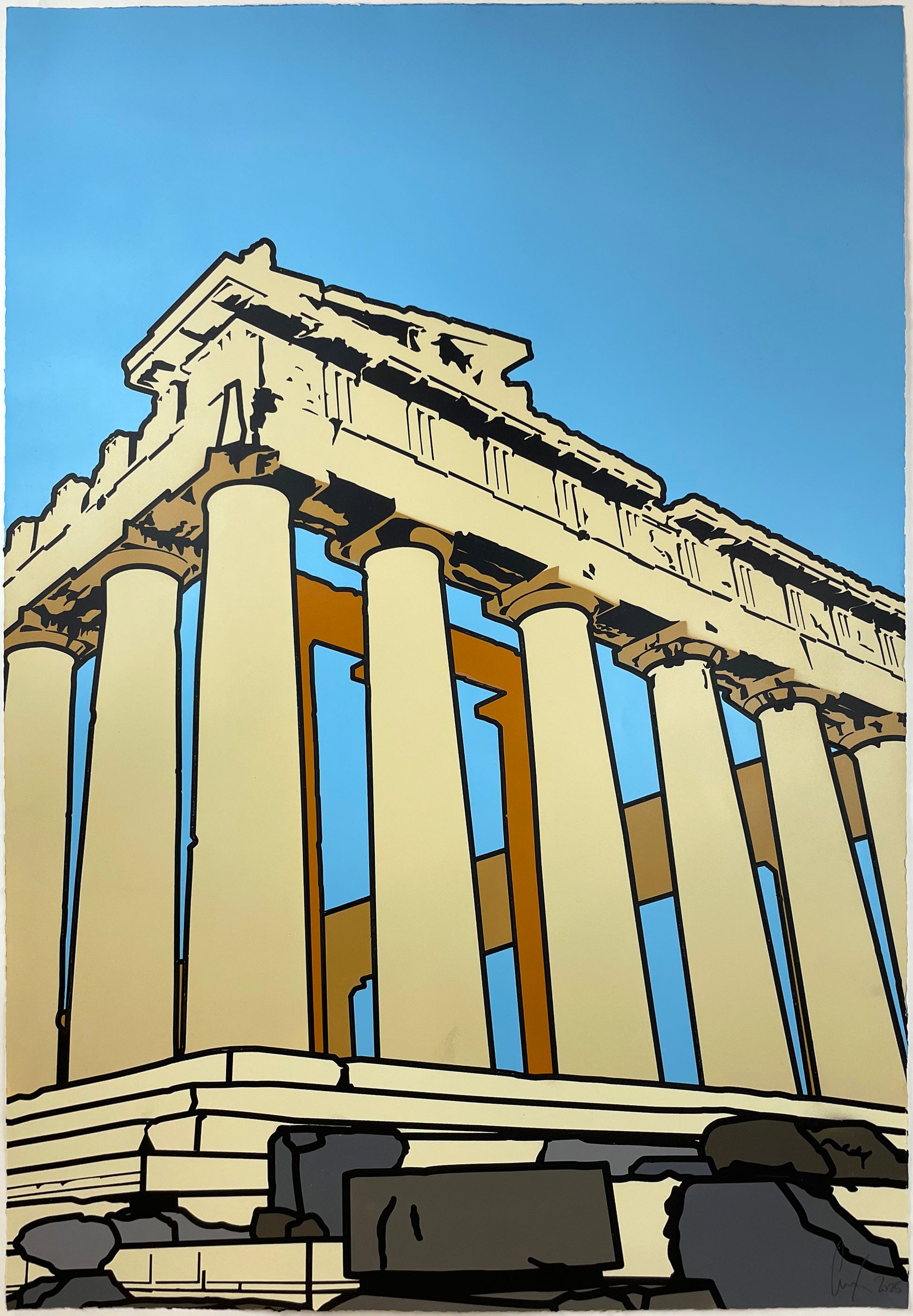 Each piece draws from the central section of the Parthenon-inspired canvas, with colours reimagined across six distinct variations. Spray-painted layers, cut and applied by hand, are finished with screen-printed key lines that lock the architecture into focus.