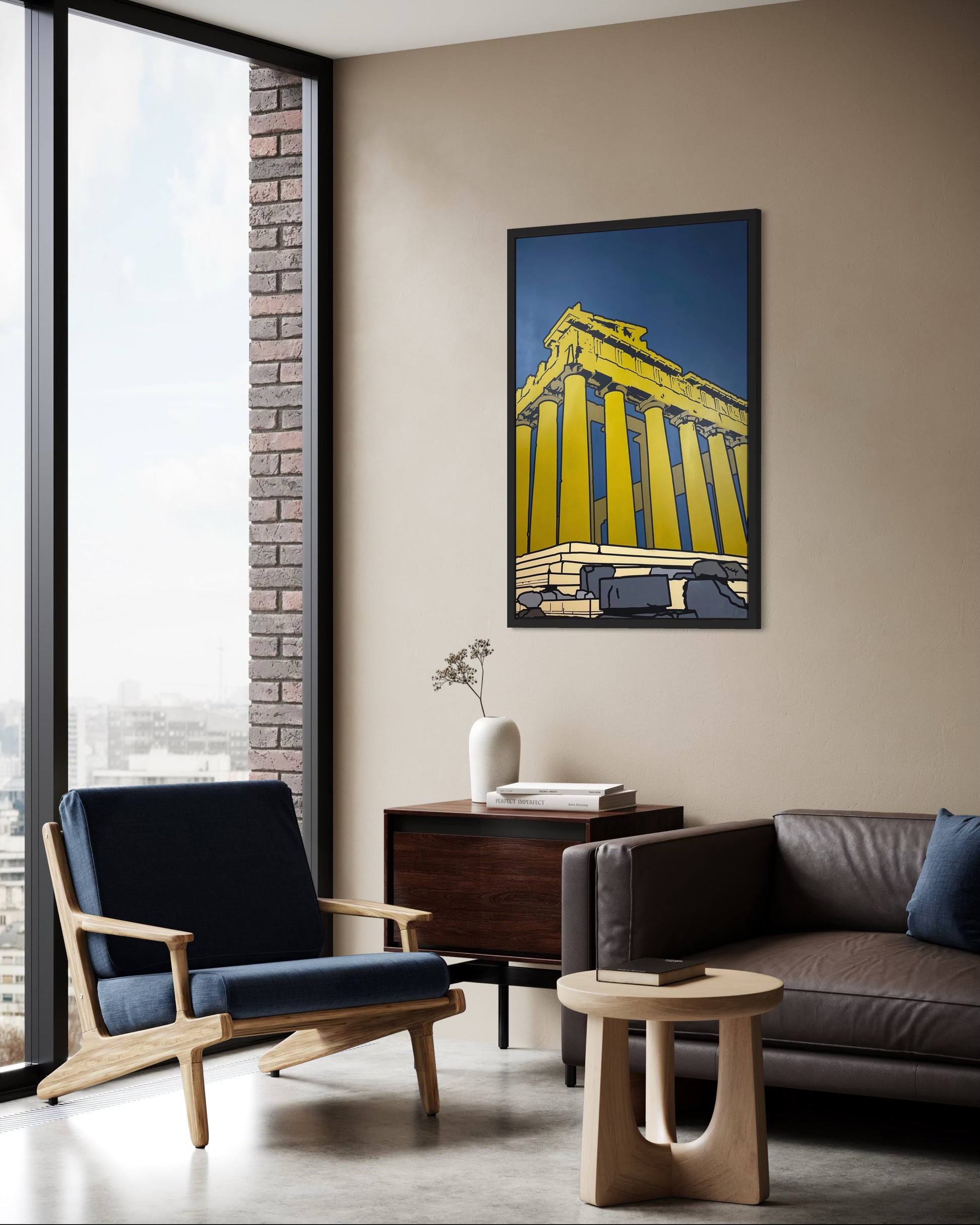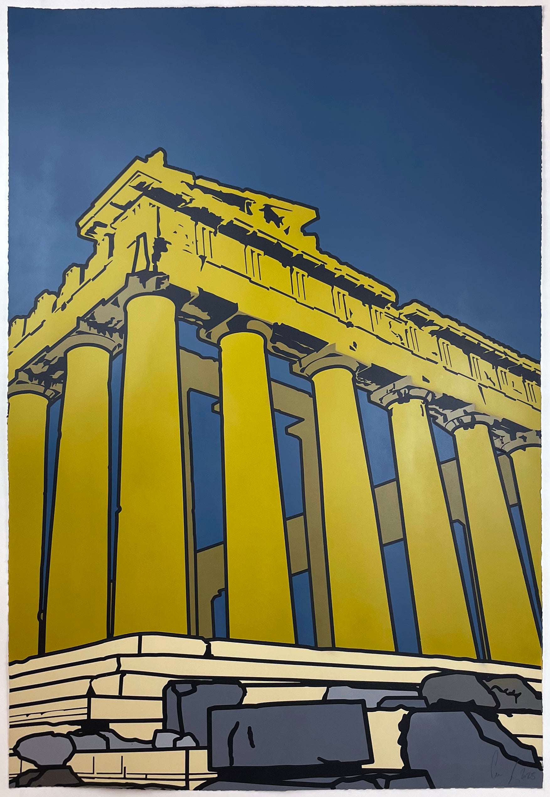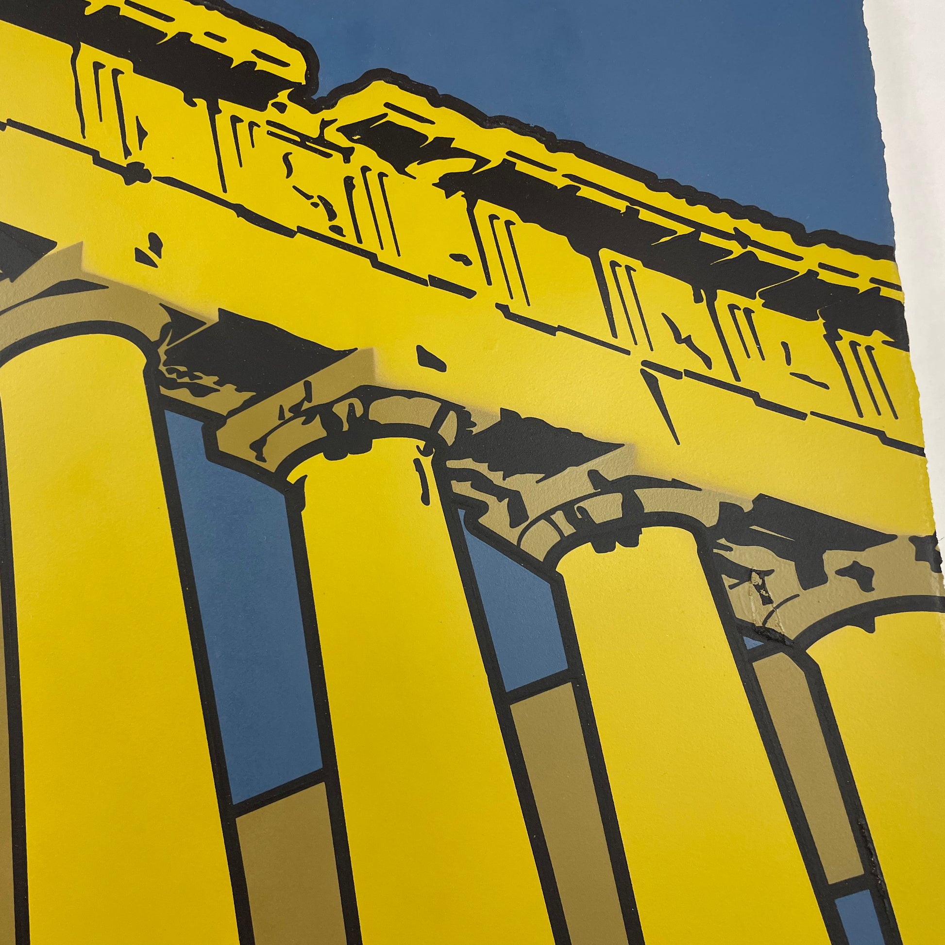 Each piece draws from the central section of the Parthenon-inspired canvas, with colours reimagined across six distinct variations. Spray-painted layers, cut and applied by hand, are finished with screen-printed key lines that lock the architecture into focus.