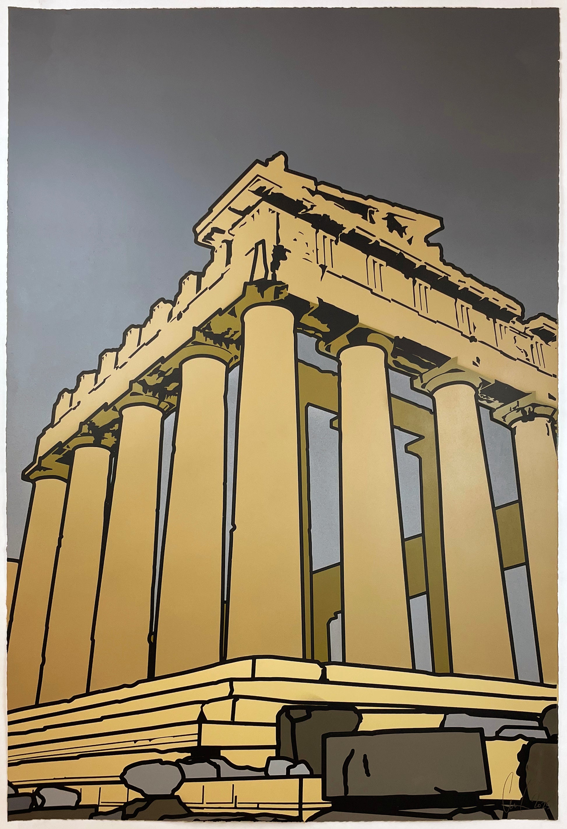 Each piece draws from the central section of the Parthenon-inspired canvas, with colours reimagined across six distinct variations. Spray-painted layers, cut and applied by hand, are finished with screen-printed key lines that lock the architecture into focus.