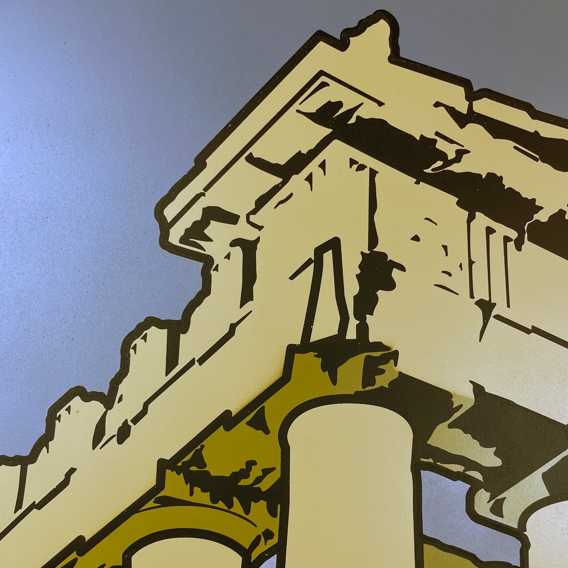 At 76 × 112 cm on 300gsm Somerset Satin, these works stand as substantial, one-of-a-kind centrepieces. Bold, pigment-dense surfaces and architectural detail combine to deliver presence and impact on the wall. Each piece is unique, and no further paper works will be produced from this commission.