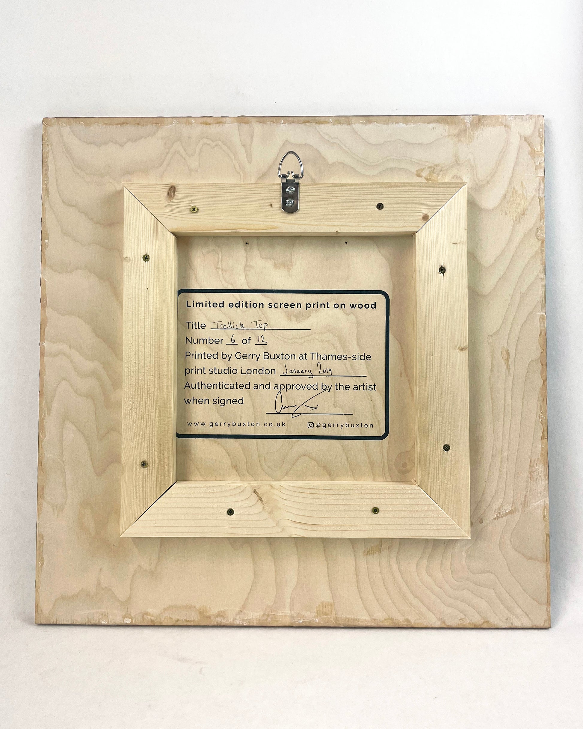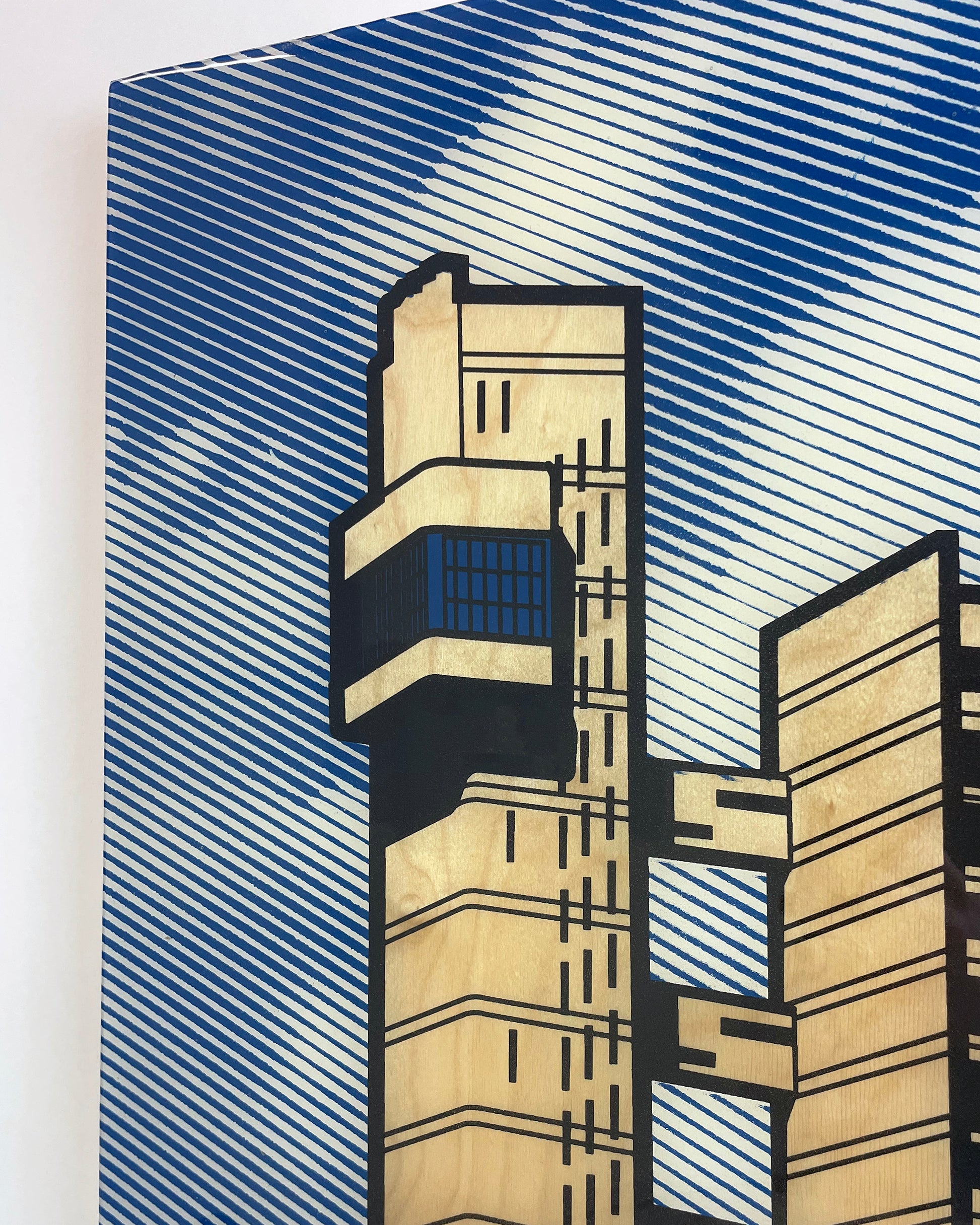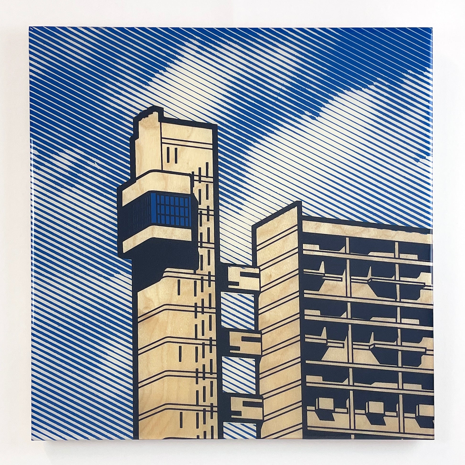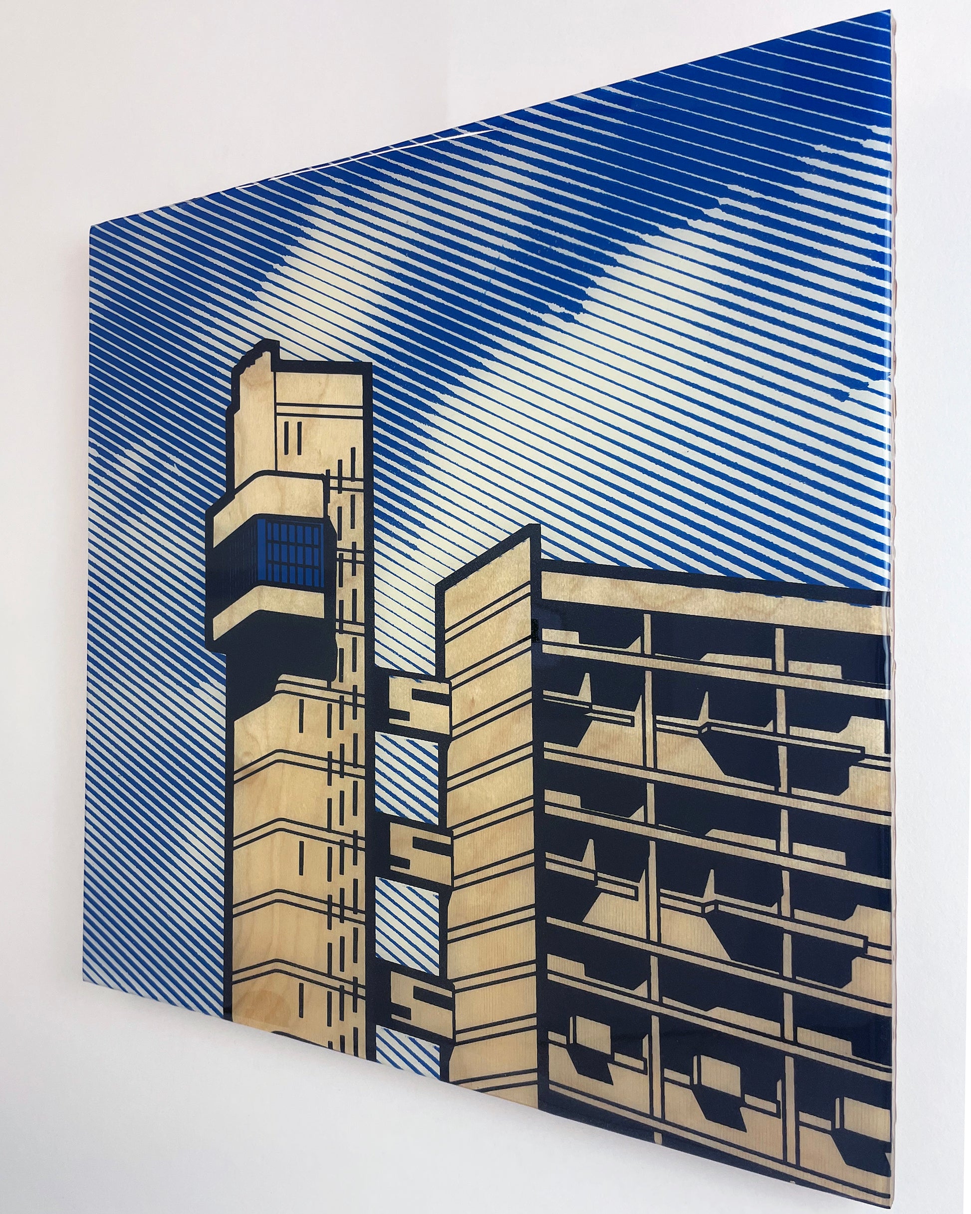 Three colour screen print on 12mm birch plywood with epoxy resin finish.