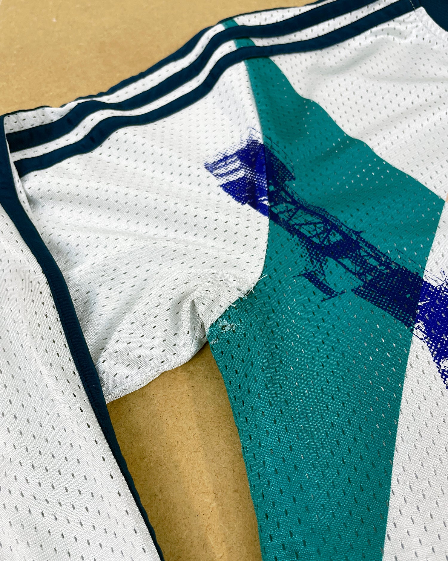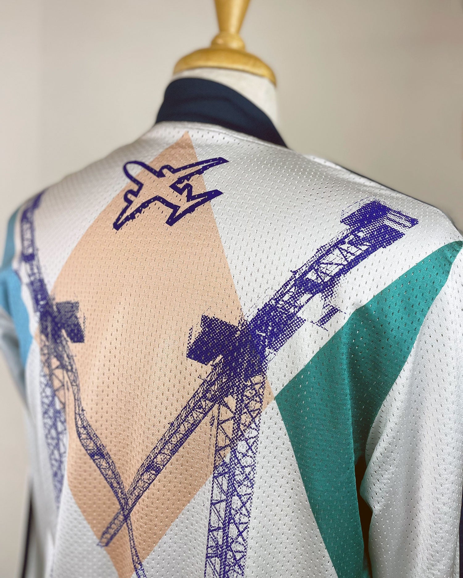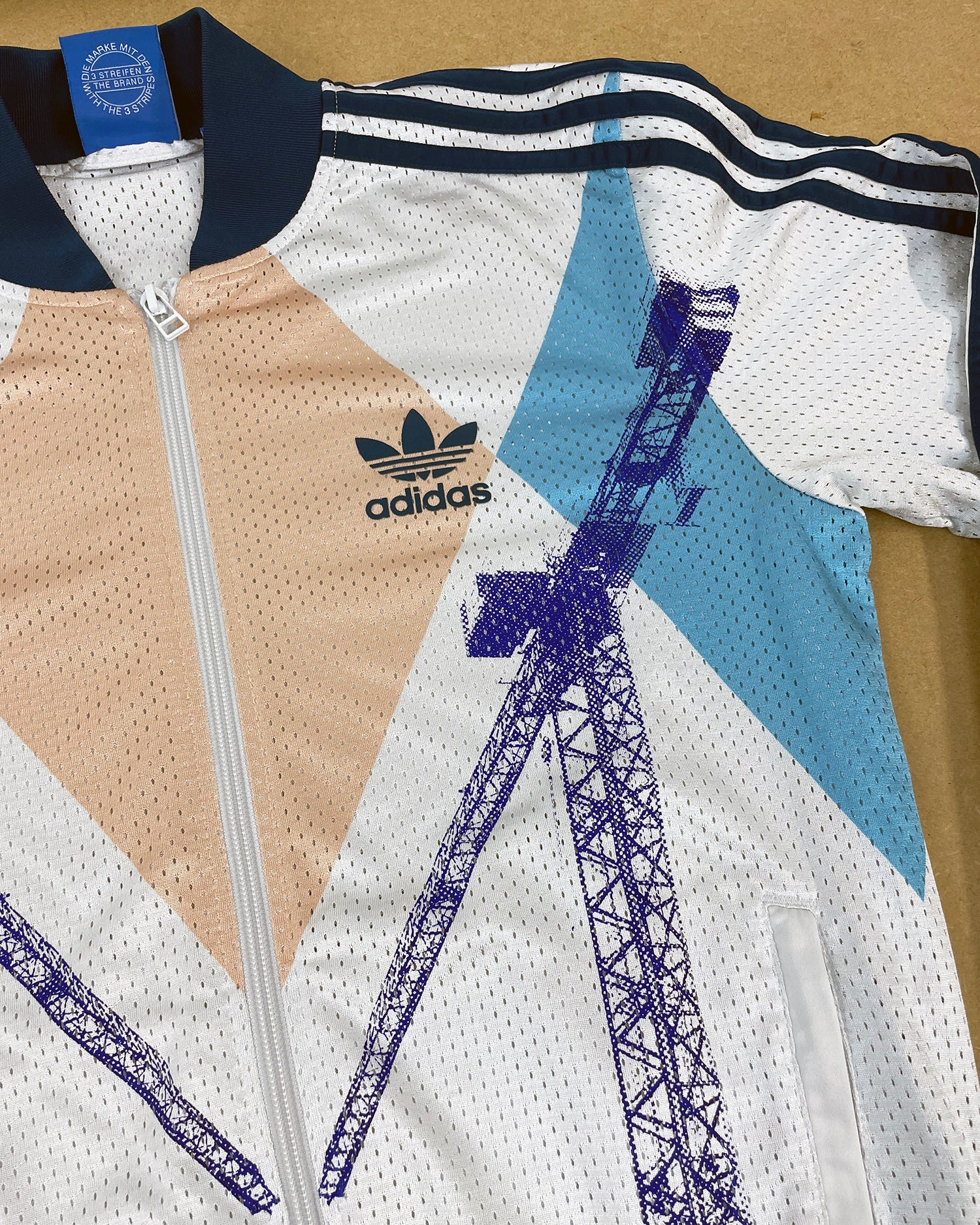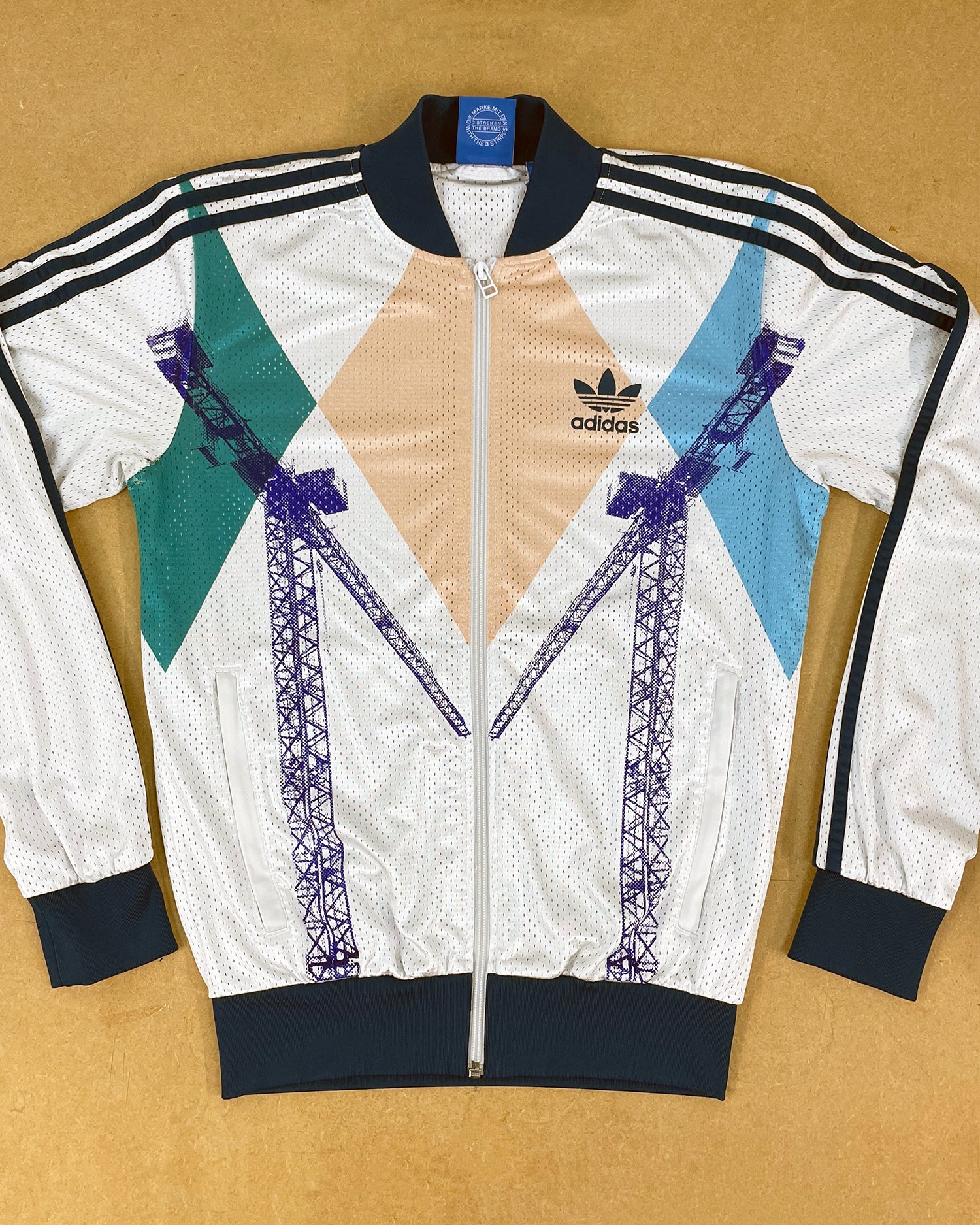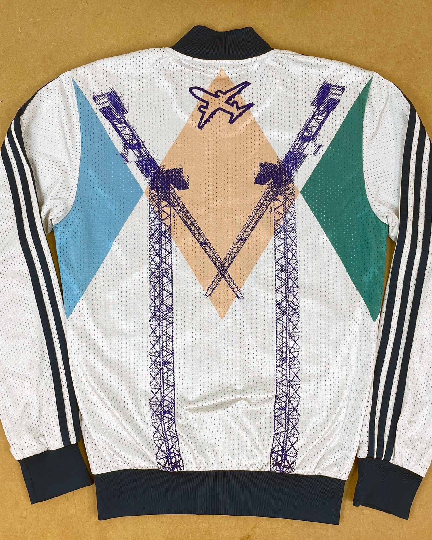 Hand printed with eco friendly water based inks, I take each finished track top home to machine wash it to test the washability of the print. These should be washed cool and hung to dry.